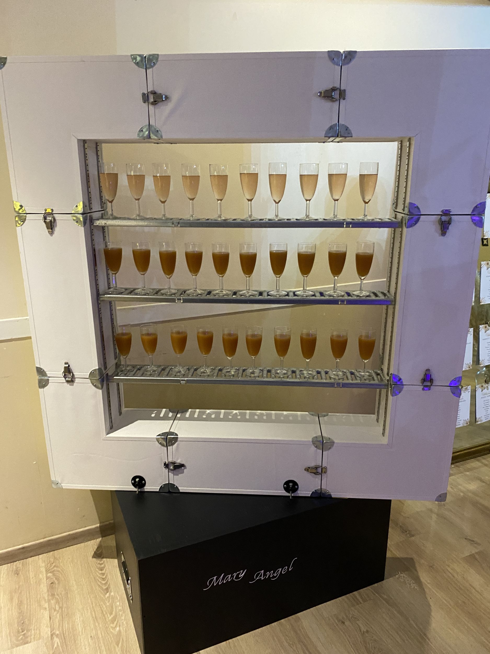 Notre bar à champagne ne se contente pas de faire pétiller les flûtes : il peut aussi afficher le plan de table de vos invités avec élégance et originalité.